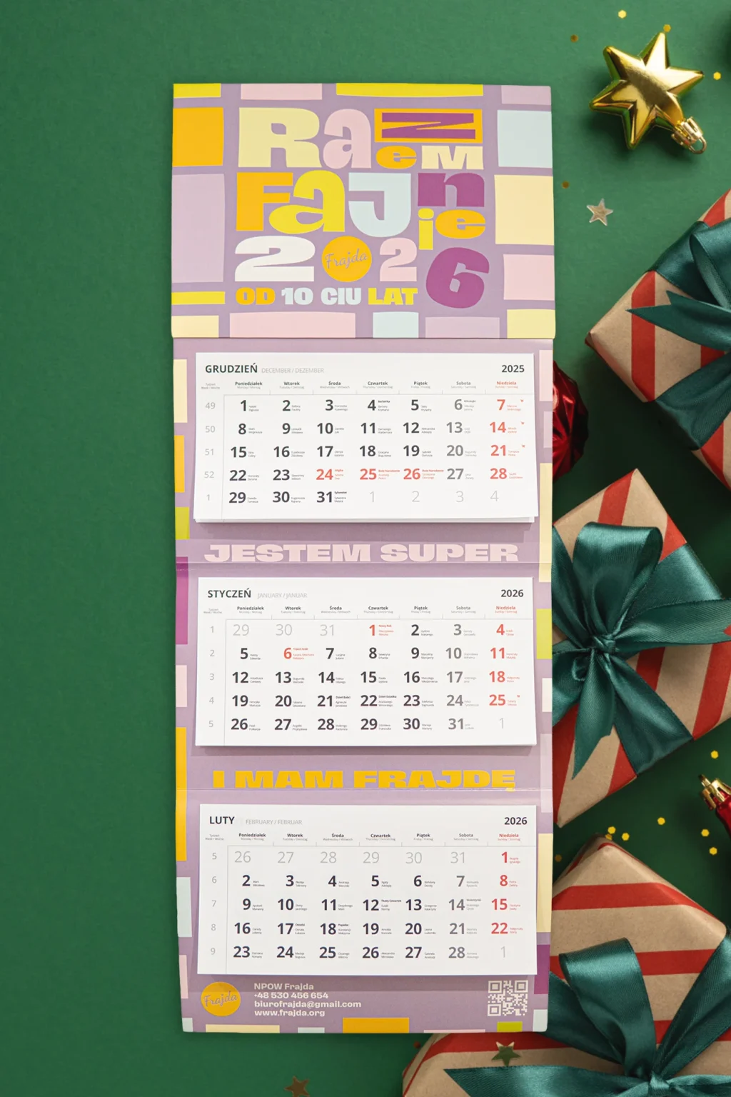 Ten kalendarz to gotowy pomysł na prezent pod choinkę dla wszystkich frajdowiczów i ich fan klubów – rodziców, dziadków, cioć, wujków i najlepszych przyjaciół. Zamiast kolejnej pary skarpet dajesz komuś rok pełen planów. Wystarczy dopisać kilka ważnych dat, a ściana od razu wygląda trochę bardziej jak backstage przed show.